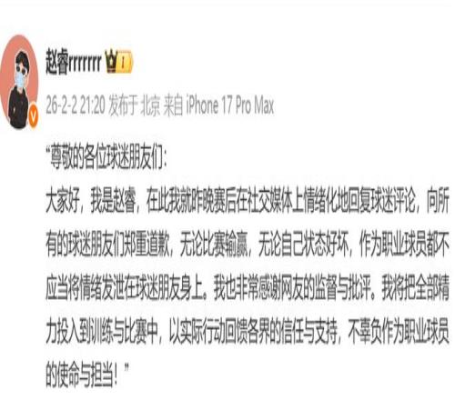 这个时候赵睿也是第一时间在社交网站上更新了动态,他明确表示:昨晚赛后在社交媒体上情绪化地回复球迷评论,向所有的球迷朋友们郑重道歉,无论比赛输赢,无论自己状态好坏,作为职业球员都不应当将情绪发泄在球迷朋友身上。其实这已经不是赵睿第一次了,之前就出现过。也希望这次事情,赵睿可以好好总结和反思吧,确实这样的言论太败人品了,也引发了无数人的不满。