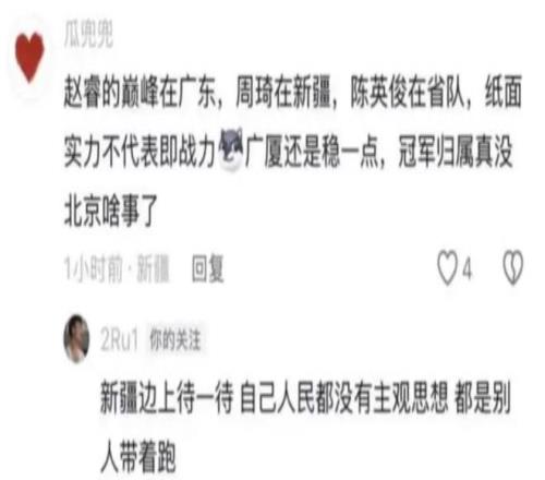 昨天赵睿的言论引发了无数人的热议,特别是新疆球迷质疑北京会不会夺冠的时候,球迷却回复:新疆边上待一待自己人民都没有主观思想都是别人带着跑。这样的话语出来之后引发了无数人的不满,不管是新疆球迷,还是CBA的球迷,全部都在表达不满。