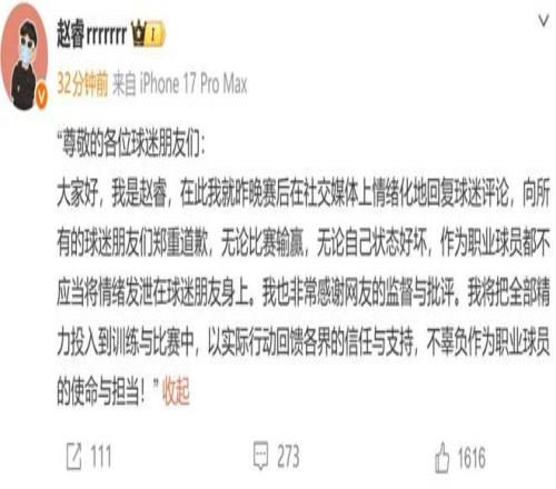 2月2日,中国男篮队长赵睿发文道歉:“尊敬的各位球迷朋友们:大家好,我是赵睿,在此我就昨晚赛后在社交媒体上情绪化地回复球迷评论,向所有的球迷朋友们郑重道歉,无论比赛输赢,无论自己状态好坏,作为职业球员都不应当将情绪发泄在球迷朋友身上。我也非常感谢网友的监督与批评。我将把全部精力投入到训练与比赛中,以实际行动回馈各界的信任与支持,不辜负作为职业球员的使命与担当!”