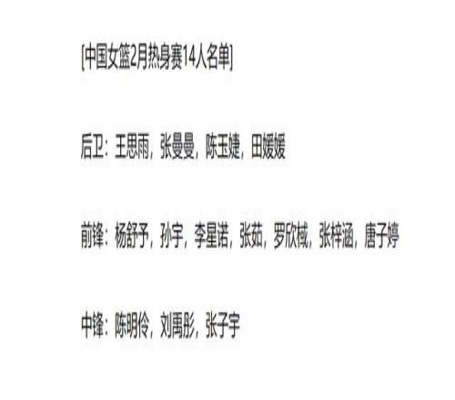 北京时间2026年2月3日消息。前天晚上,本赛季的WCBA女篮联赛常规阶段结束,接下来,联赛球员将开始备战“俱乐部杯比赛”。而国家队也在这个时间段有着新的任务:2月的2场热身赛。时间是2月7日、2月11日,在合肥、银川同国际联赛比赛。目前,中国队对外公布了14人的大名单。这份人员中,绝大部分球员近期都在北京集训,而王思雨、张子宇两位球员,则是重新回到国家队中。