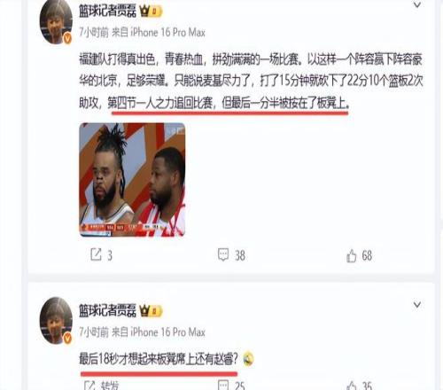 北京球迷也纷纷鞭挞主教练许利民,“许利民这用人是真牛批,第四节关键时候上方硕和张才人,这俩小天才一通乱搞,一个乱扔,一个乱犯规,本身靠麦基一波打篮下追上了,后边全是外边乱扔又给送回去。”许利民没有用足用够用好麦基,打得最好的他只打了16分钟,而其他外援和周琦上场时间均比他多,连0分的张才仁也比麦基多打了7分钟。球迷怒问为何第一外援只打了16分钟?球迷调侃:“别的队限制不了麦基,老许可以”、“脓包竟是许大师自己”。显而易见,京媒京迷一致把矛头对准许利民,认为他才是输球的最大脓包。诸位,你们认为呢?