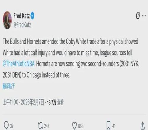 北京时间2月7日上午11点,据NBA记者Fred Katz报道,科比-怀特的体检出了问题,黄蜂队发现怀特的左小腿受伤,需要缺席一段时间。这笔交易已经在两天之前官宣完成,今天黄蜂和公牛紧急修改了交易方案,黄蜂撤回1个次轮签。