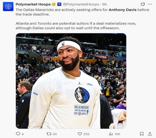 ESPN记者布兰德-麦克马洪表示,因为安东尼-戴维斯的交易价值缩水,独行侠愿意在AD的交易中只获得首轮签、年轻球员、到期合同,这样可以获得未来薪金空间的灵活性。由于老鹰队的波尔津吉斯、肯纳德是到期合同,所以老鹰是最值得关注的潜在买家。猛龙已经不再愿意为了AD拆散他们现有的阵容。