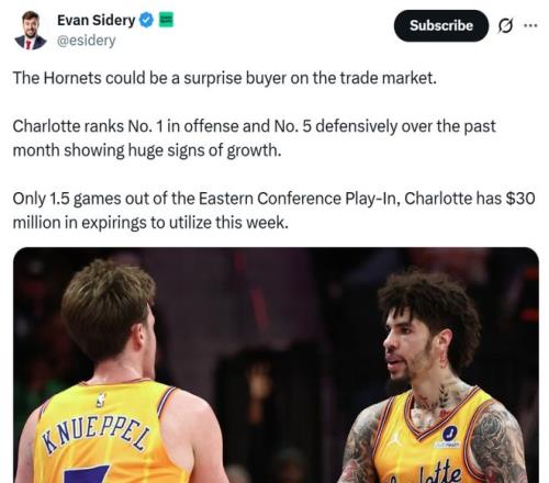 在豪取7连胜强势北伐的同时,黄蜂队还手握3000万到期合同,美记Evan Sidery曝他们将成为交易截止日前的黑马之一。