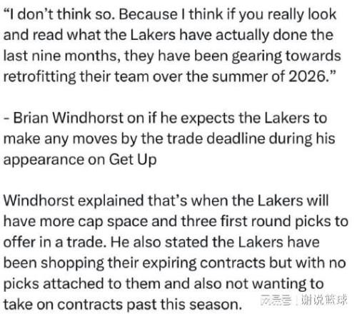 就连包括温德霍斯特在内的其他记者,也觉得湖人之所以不想留住詹姆斯,是因为放弃在这个赛季争冠可能性。所以哪怕截止日前,湖人都不太可能做出有效补强,凑合把这个赛季给熬完,等今年夏天詹姆斯合同到期,双方分道扬镳以后,湖人可以腾出薪资空间。到时候管理层工作很多,比如需要给里夫斯开出新合同,八村塁、艾顿和斯玛特等人,可能面临续约事宜,詹姆斯的未来去向,同样会成为焦点。