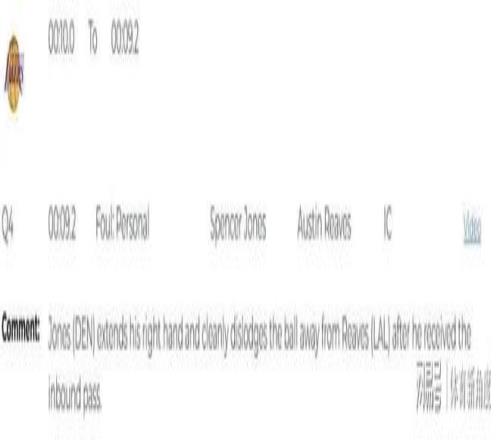 让我们将时光回溯至第四节尾声,彼时距离比赛结束仅剩9.2秒,湖人队以113比116的微弱劣势落后。就在这之际,斯宾塞·琼斯展现出了他敏锐的防守嗅觉与迅捷的身手。当里夫斯住界外发球,正欲组织进攻之时,琼斯犹如猎豹出击,伸出右手,以一种近乎艺术般的动作,干净利落地将球从里夫斯手中拍落。然而,令人诧异的是,当值裁判却吹响了哨声,判定琼斯犯规,并慷慨地赐予里夫斯两次宝贵的罚球机会。这,无疑是一次误判,一次对比赛公平性造成重大影响的误判。