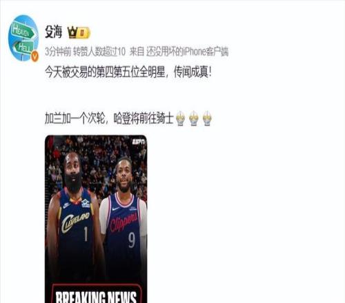 北京时间2月4日,NBA交易市场在截止日前迎来关键动作,据知名记者沙姆斯·查拉尼亚报道,洛杉矶快船与克利夫兰骑士已达成交易,詹姆斯·哈登与达里厄斯·加兰互换东家。