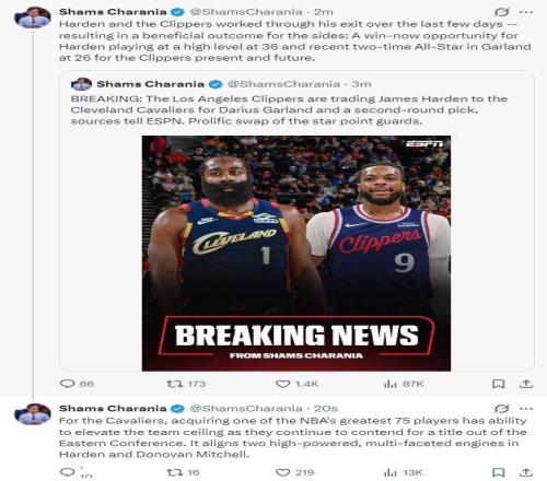 交易完成后,骑士队的潜在首发阵容预计为:詹姆斯·哈登、多诺万·米切尔、杰隆·泰森、埃文·莫布利和贾勒特·阿伦。