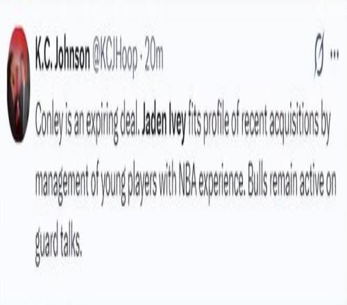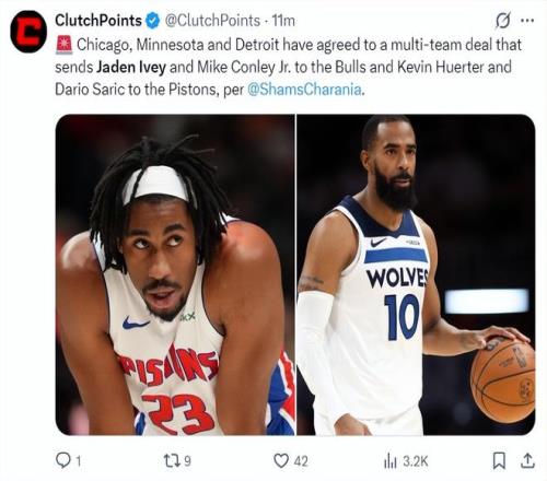 核心框架是:公牛送出23岁的后卫杰登·艾维,从森林狼得到38岁的控卫迈克·康利,活塞则从森林狼得到后卫凯文·赫尔特与前锋达里奥·萨里奇,森林狼作为促成交易的一方,主要收获是来自公牛的2026年首轮签互换权以及一个价值250万美元的交易特例。