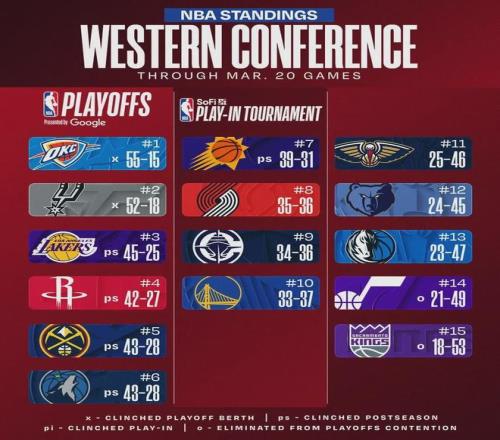 北京时间3月21日,NBA常规赛:掘金121-115战胜猛龙,火箭117-95大胜老鹰,森林狼104-108不敌开拓者。西部排名又出现了比较大的变化:火箭和掘金各上升一位,森林狼跌至第六。此外,开拓者反超快船,升至西部第八。
