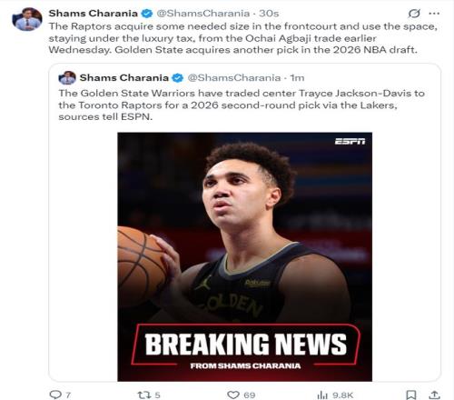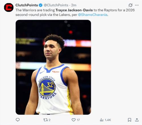 很快Shams接着报道,勇士队将杰克逊-戴维斯交易到猛龙队,换来一个2026年的次轮签。这个次轮签是勇士队从湖人处得到的2026年次轮签。猛龙队通过阿巴基的交易已经避免了奢侈税,得到TDJ后也获得了更大的尺寸优势。