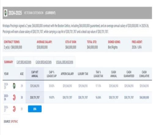 这笔交易预示着勇士队或许已经放眼休赛期了,因为波尔津吉斯25-26赛季3073万是到期合同。他本赛季只为老鹰打14场比赛,场均24.1分钟,拿到16.9分4.6篮板2.9助攻0.64抢断1.21盖帽,命中率46.7%,三分命中率36.7%。