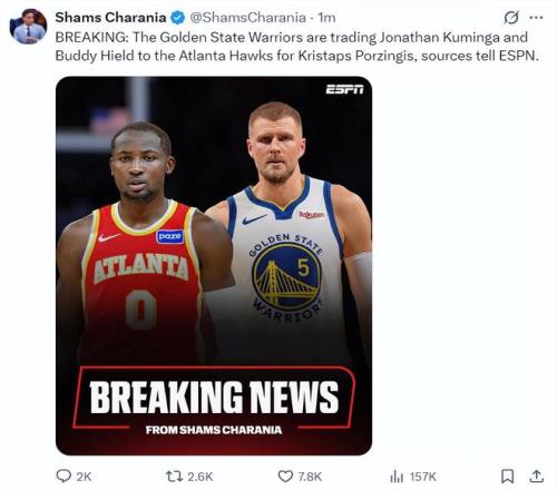 北京时间2月5日,根据ESPN记者Shams的报道,勇士、老鹰达成一笔交易,勇士用巴迪-希尔德、乔纳森-库明加换取了克里斯塔-波尔津吉斯。