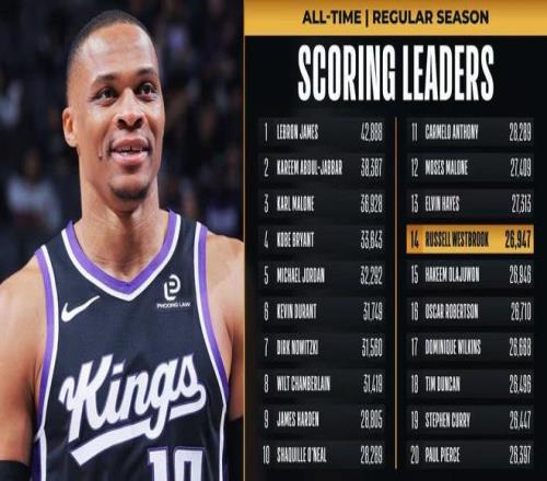 威少常规赛总得分超越火箭名宿奥拉朱旺,升至NBA历史总得分榜第14位。