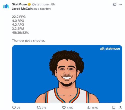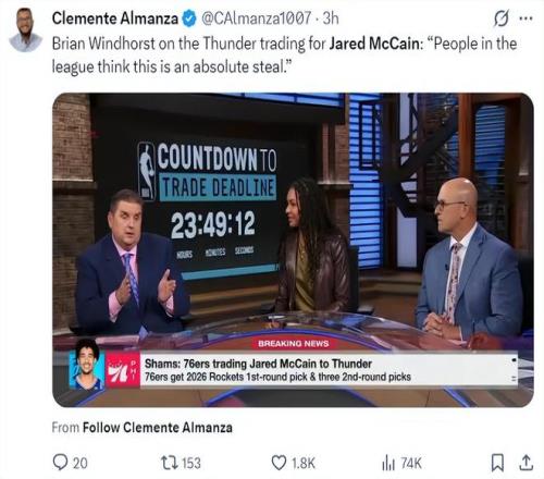 ESPN记者布莱恩-文霍斯特在播客节目中这样说道:联盟内部人士普遍认为,雷霆4换1得到麦凯恩是绝对划算的。他在节目中提到了4个要点,因为篇幅太长,我这里就精简一下他的观点: