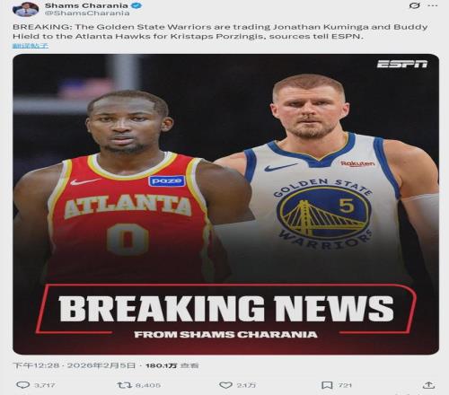 北京时间2月5日中午12点半,据NBA名记Shams报道,勇士连续达成两笔交易:1、将库明加、希尔德交易至老鹰,2换1得到波尔津吉斯;2、勇士将中锋TJD送去猛龙,换回今年的1个次轮(来自湖人)!这两笔加起来就是3换2!