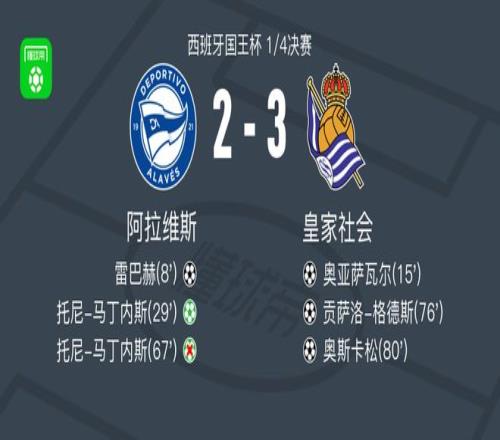 北京时间2月5日西班牙国王杯 1/4决赛,阿拉维斯对阵皇家社会。阿拉维斯雷巴赫破门,托尼-马丁内斯破门。皇家社会奥亚萨瓦尔破门,贡萨洛-格德斯破门,奥斯卡松破门。最终比分阿拉维斯 2-3 皇家社会。