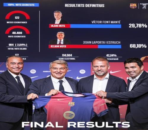 在3月15日举行的巴萨主席选举中,拉波尔塔以68.18%的得票率优势大胜对手丰特(29.78%),成功赢得连任。在巴萨出色竞技表现的帮助下,这位在任主席赢得了个人第四次选举,将在未来五年继续领导巴萨。