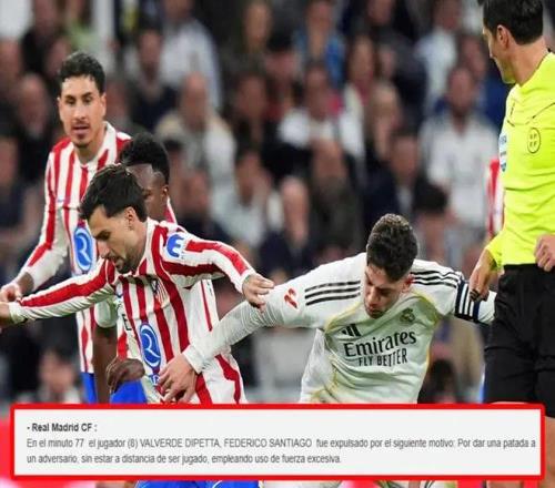 据悉,主裁判何塞-穆努埃拉的裁判报告中写明:第77分钟,8号球员费德里科-圣地亚哥-巴尔韦德-迪佩塔被红牌罚下,被罚原因是在距离可触球范围之外踢击对手,且使用了过度力量。