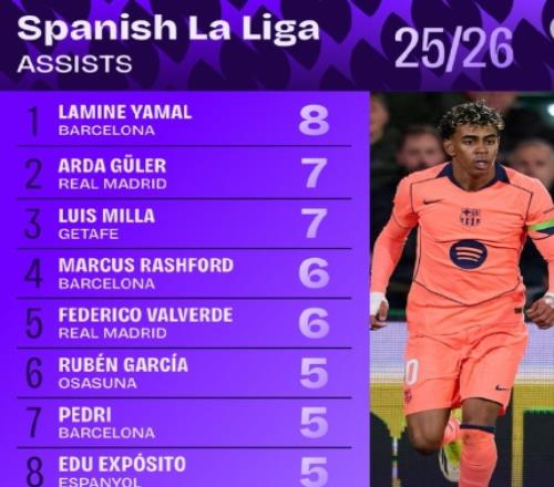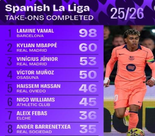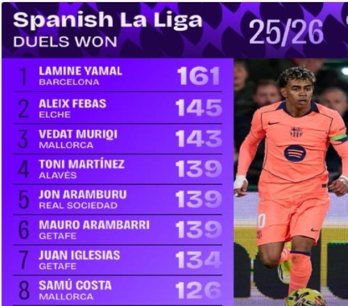 体育播报02月05日宣 本赛季西甲截止至今,据Squawka统计,亚马尔在多项数据霸榜。