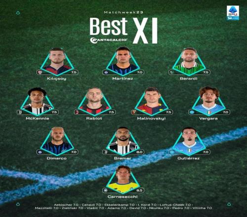 意甲官方公布了联赛第23轮的最佳阵容,劳塔罗、迪马尔科、麦肯尼、拉比奥、布雷默在列。