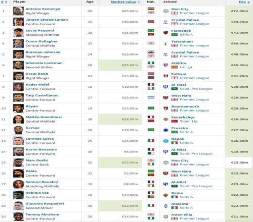 1、塞门约(伯恩茅斯→曼城)7200万欧
