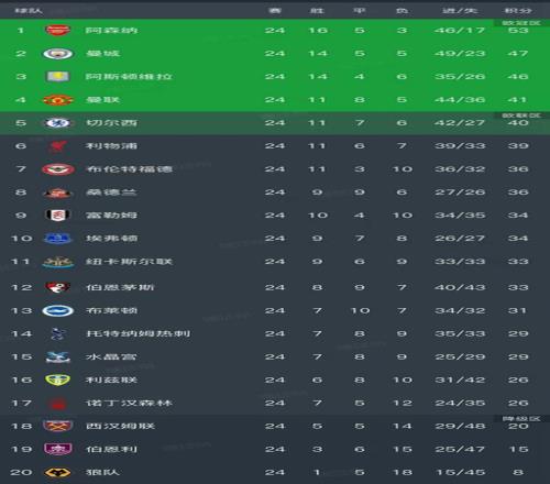 切尔西以40分暂列第5名,利物浦以39分暂列第6名,他们都还有很大的机会冲击前四,目前最大的竞争对手就是第4的红魔,蓝军落后红魔1分,红军落后红魔2分。布伦特福德、桑德兰、富勒姆、埃弗顿、纽卡斯尔联、伯恩茅斯和布莱顿的积分都在30分以上,暂列第7-第13名。西汉姆联20分,伯恩利15分和狼队8分处于降级区,排在最后三名。