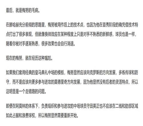 在这个思路下,梅努就应该多练传球,多练接球之前的移动,练防守中的选位和补防的意识,而不是练带球、突破,甚至是射门,这是明显练错了东西,搞错了发展方向。