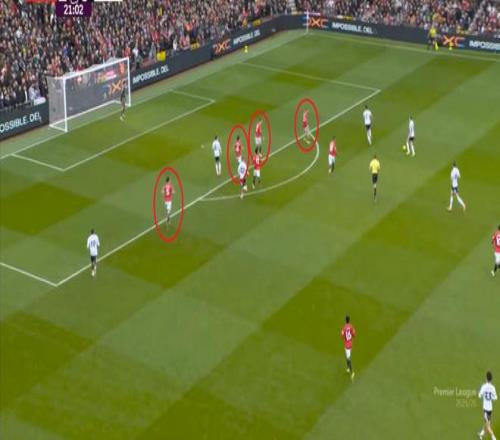 这说明位置变化的一大原因,可能是出于库尼亚作为南美球员对于站位纪律的忽视,但正因为卡里克在前场倾向于使用小个子球员,所以大家的活动范围其实都不小,而且很适应,于是在进攻发起的时候,曼联在前场的站位顺序已经变成了姆贝乌莫-布鲁诺-库尼亚: